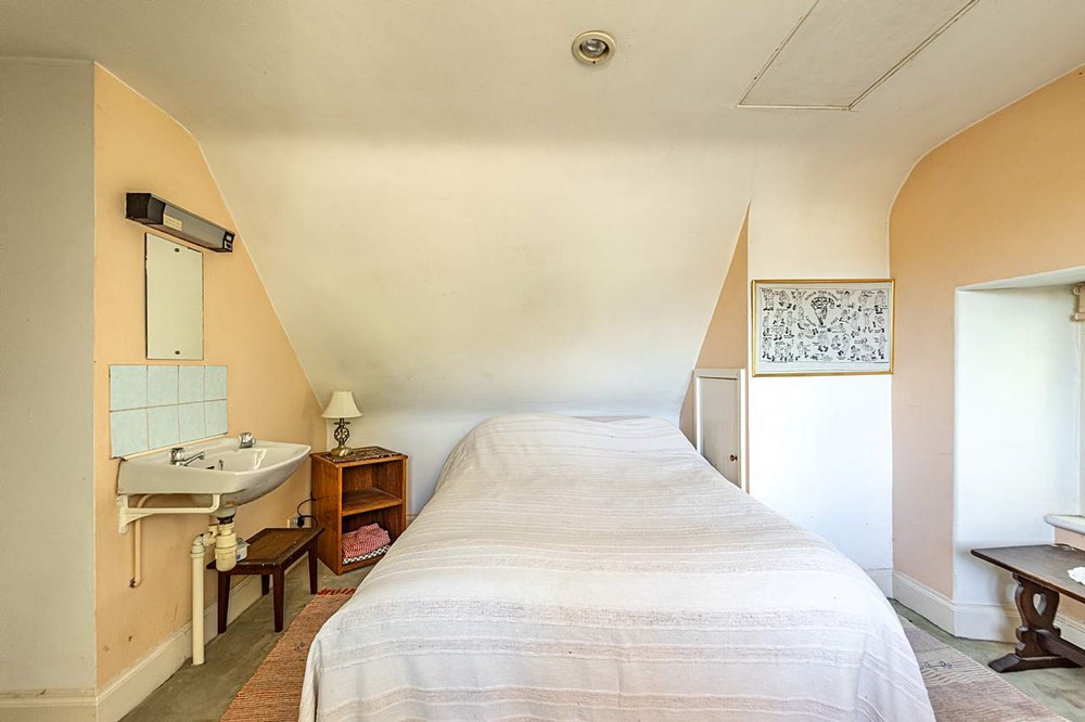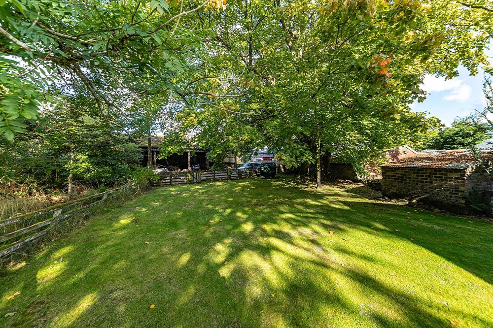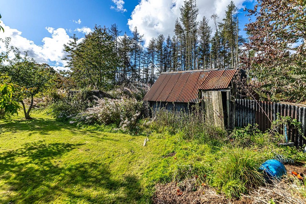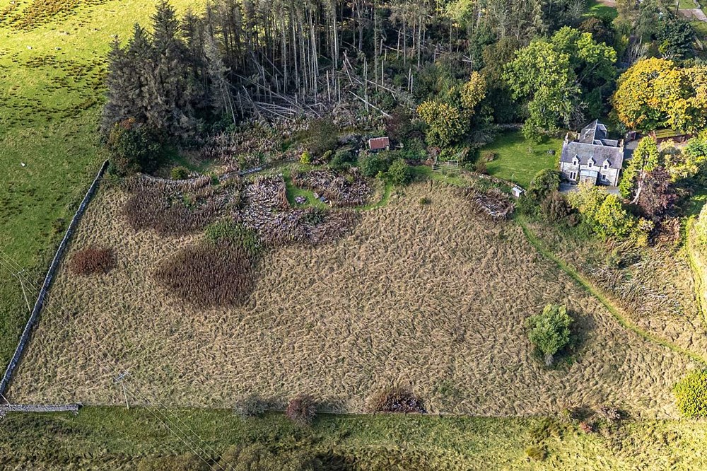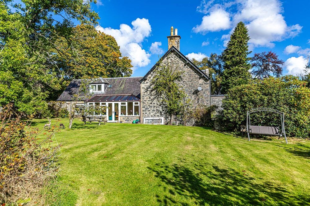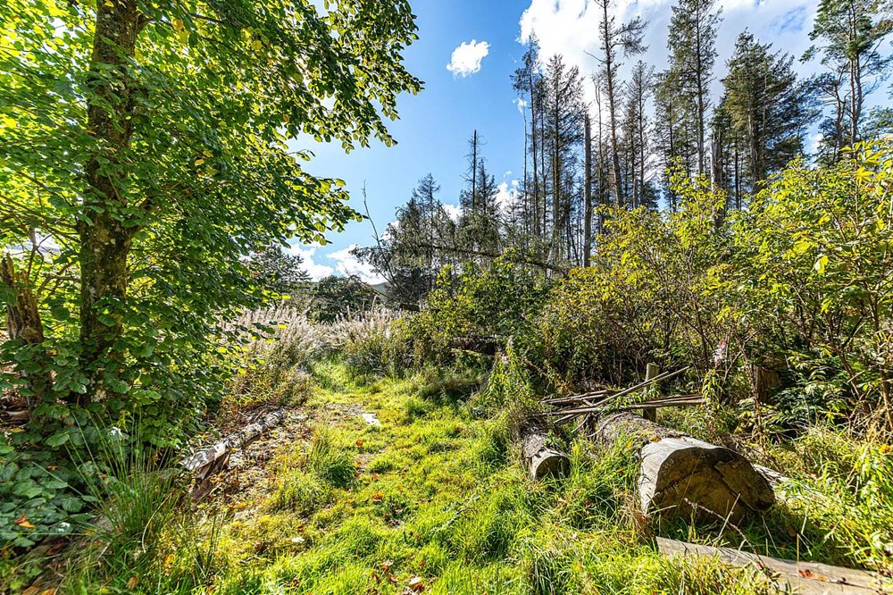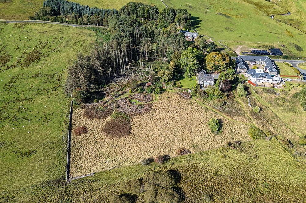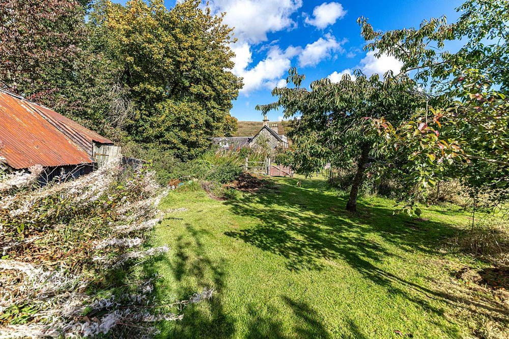 - Garden ground with open field, woodland area and outbuildings